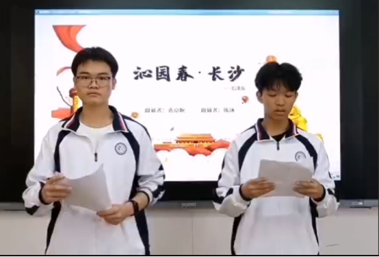 物联2102班黄嘉顺、陈泳配乐朗诵毛泽东《沁园春长沙》,立志不负同学少年。