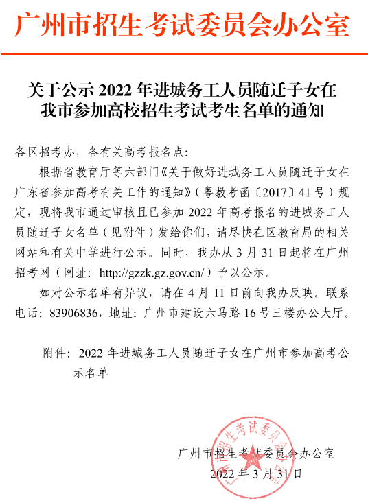 关于公示2022年进城务工人员随迁子女在我市参加高校招生考试考生名单的通知
