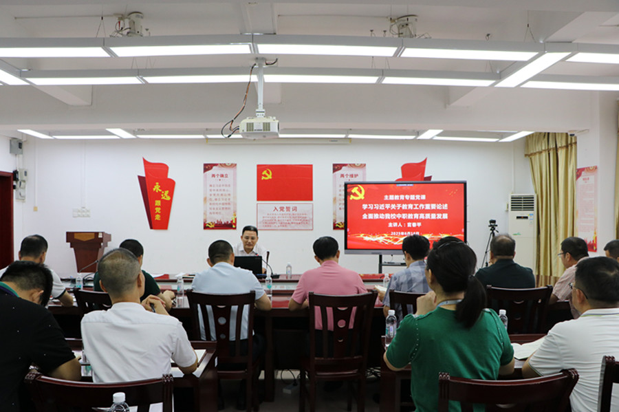 6月16日,官春平副校长在琶洲校区办公楼二楼大会议室为中职教育部全体党员上了以“学习习近平关于教育工作重要论述,全面推动我校中职教育高质量发展”为主题的主题教育专题党课。