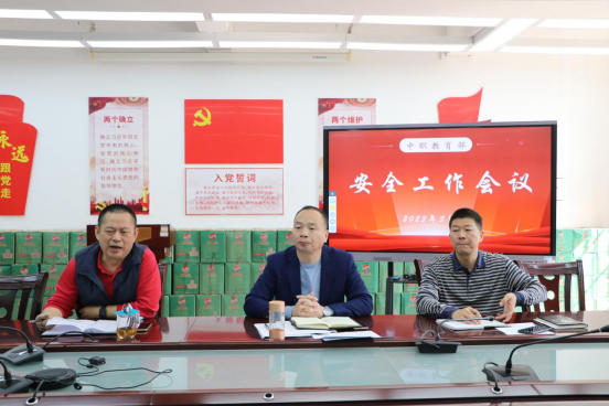 3月1日上午9:00,中职教育部在办公楼二楼会议室召开2023年校园安全工作会议。中职部党总支书记罗维东,中职部主任郑耀涛及中职教育部系副主任以上干部参加会议。会议由中职教育部副主任杨育斌主持。