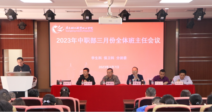 3月7日下午,中职教育部在琶洲校区学术报告厅召开三月份全体班主任会议暨2022-2023第一学期优秀班主任表彰大会,中职教育部党总支书记罗维东、中职教育部主任郑耀涛、副主任杨育斌、学生管理部门负责人、各系副主任、名班主任工作室成员以及全体班主任、学生部门管理人员参加了本次大会,会议由学生科陈树华科长主持。
