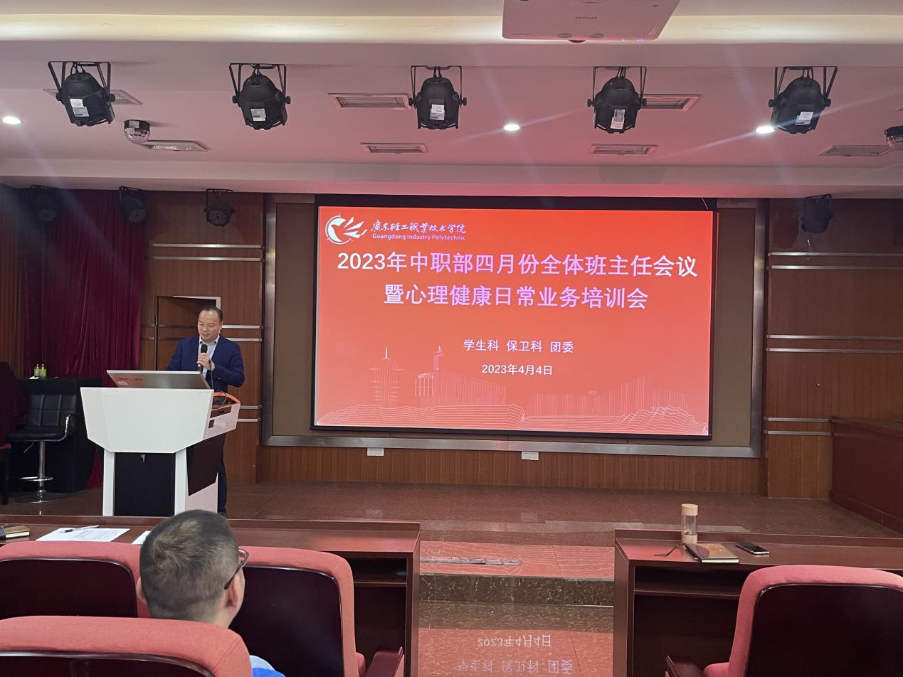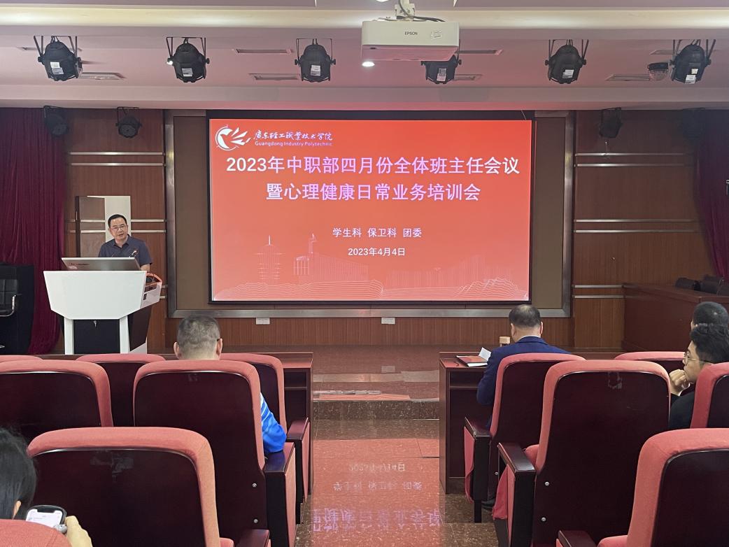 2023年4月4日下午,中职教育部在琶洲校区报告厅召开了四月份全体班主任会议,参加本次会议的有中职教育部党总支罗维东书记、杨育斌副主任、学生管理部门负责人、各系副主任以及全体班主任。本次会议由学生科陈树华科长主持。