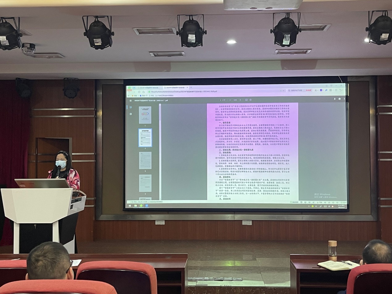 随后团委叶雪芬副书记就2023年“校园美育节”活动方案进行了解释说明,本次校园美育节活动主题是:承传统文化·扬校园之美,坚持传统优秀文化和校园特色文化为导向,共22个特色文化活动项目。