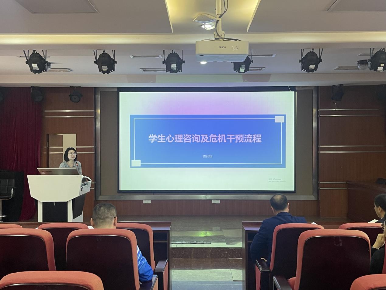 首先由心理咨询中心陈珂铭老师为全体班主任进行了《学生心理咨询及危机干预流程》的培训,陈老师从心理咨询的知识、心理咨询预约方式、保密原则、危机干预、注意事项等五个方面,结合中职教育部学生的实际情况,详细科普了学生心理咨询的有关知识并重点讲解了学生心理危机干预的流程、应注意的事项等,本次培训是加强班主任心理健康工作的有效培训,规范了学生心理危机干预流程,极大提升了班主任应对心理危机学生的工作技巧和能力。