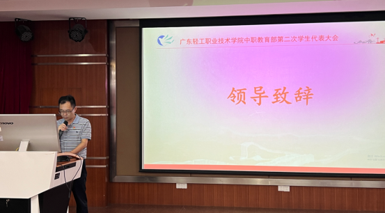 6月19日下午,中职部在琶洲校区新公寓二楼学术报告厅隆重召开第二次学生代表大会。学校副校长梅建波,中职教育部党总支书记罗维东、主任郑耀涛,学生工作部门负责人和各专业系副主任以及157名学生代表参加了本次学生代表大会。大会由第一届学生会主席团成员谭诗雨同学主持。