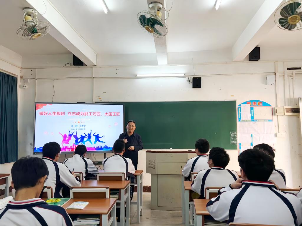 学校副校长官春平在琶洲校区汽车工程系303课室,为我校中职教育部新能源汽车2302班的学生讲授了主题为“做好人生规划 立志成为能工巧匠、大国工匠”的思政教育课。
