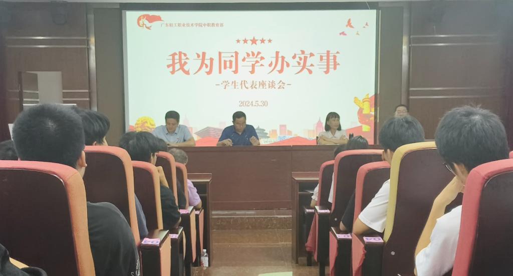 5月30日下午,中职教育部团委在学术报告厅组织召开“我为同学办实事”学生代表座谈会。教务科、学生科、总务科等部门负责人参加了座谈会,会议由团委书记林得鹏主持。