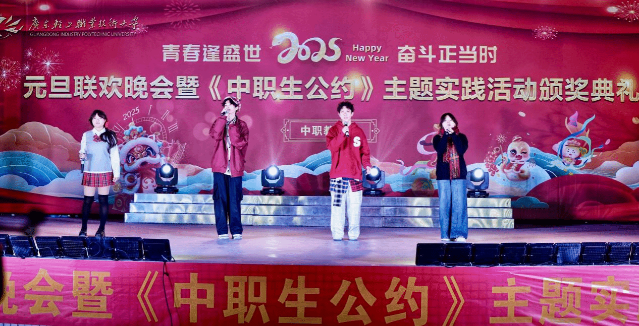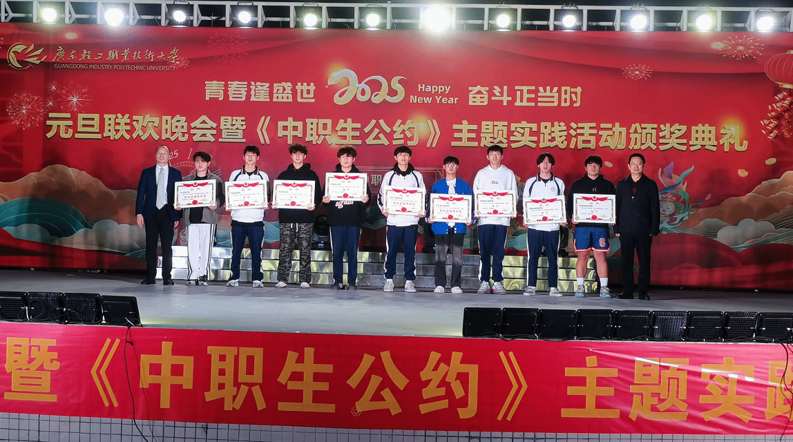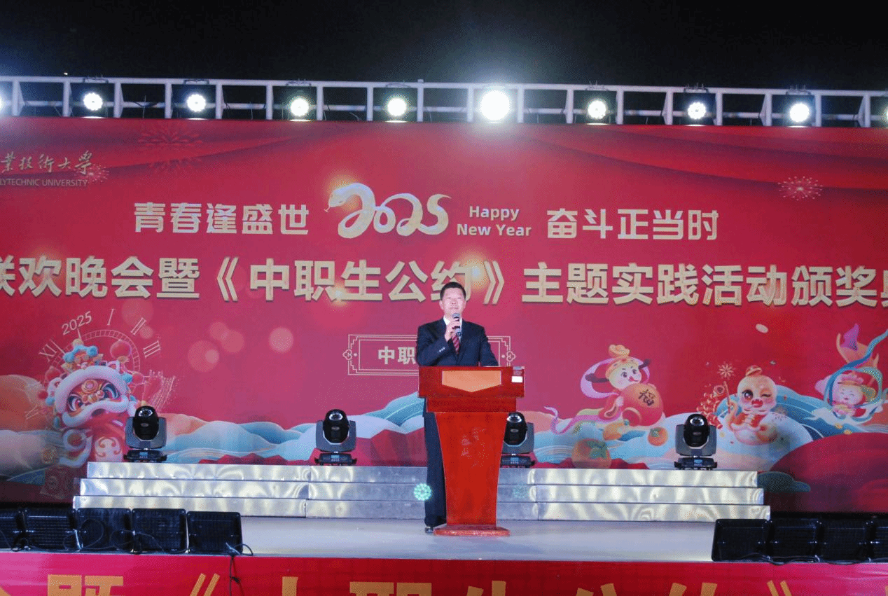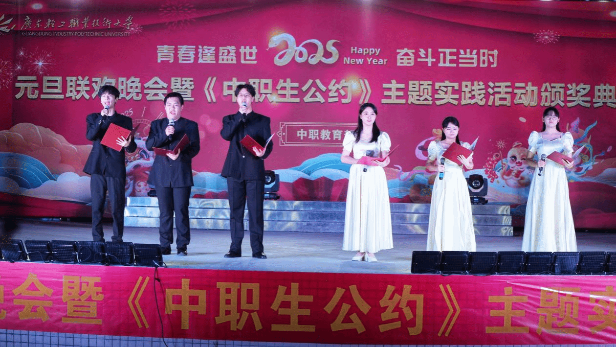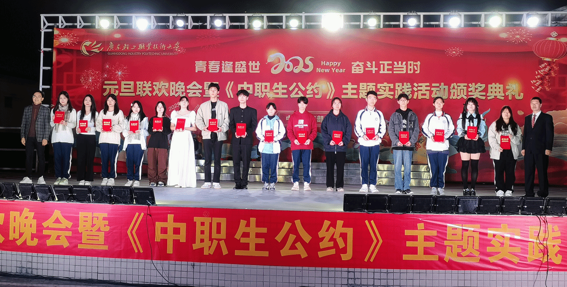 2024 年12月26日晚,广东轻工职业技术大学琶洲校区隆重举行了2025 年元旦晚会暨《中职生公约》主题实践活动颁奖典礼,全体师生欢聚一堂,共迎新年。学校学生工作部杨伟柱主任、中职部党总支罗维东书记、郑耀涛主任、杨育斌副主任、高武义副主任和各部门负责人、各班班主任、各社团指导老师以及全体学生共3000余人参加了盛会。