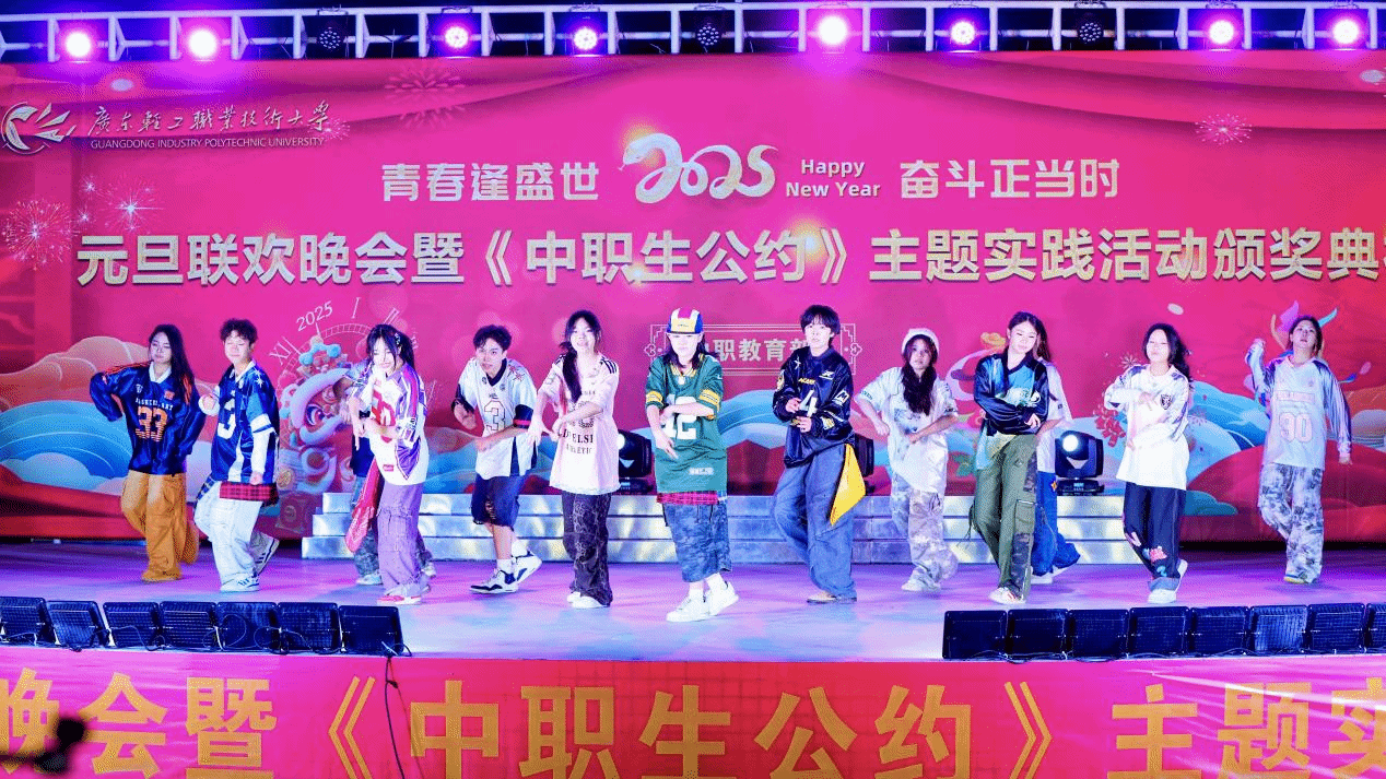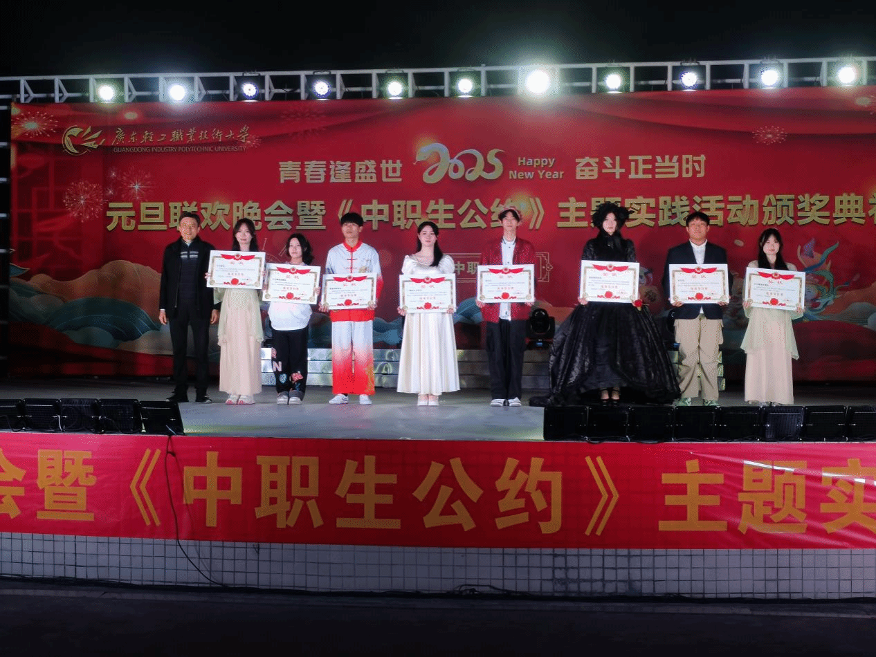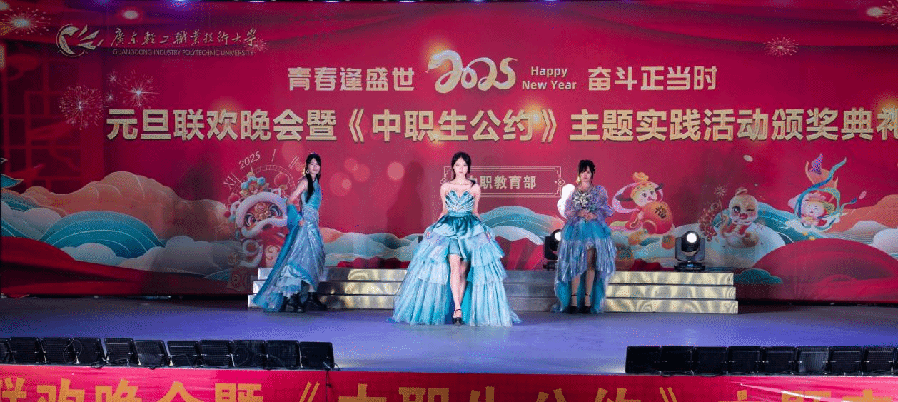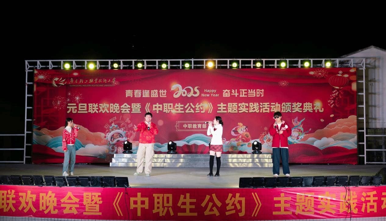2024 年12月26日晚,广东轻工职业技术大学琶洲校区隆重举行了2025 年元旦晚会暨《中职生公约》主题实践活动颁奖典礼,全体师生欢聚一堂,共迎新年。学校学生工作部杨伟柱主任、中职部党总支罗维东书记、郑耀涛主任、杨育斌副主任、高武义副主任和各部门负责人、各班班主任、各社团指导老师以及全体学生共3000余人参加了盛会。